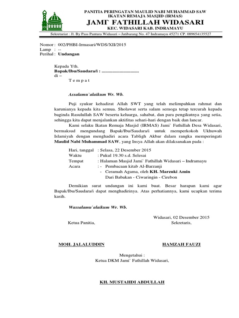 Contoh Surat Undangan Maulid Pdf - Contoh Surat Undangan Phbi Maulid Doc - Sample Surat Undangan - Dengan memanjatkan puja dan puji syukur kehadirat allah swt , dan salam kepada nabi besar muhammad saw.. Savesave surat undangan peringatan maulid nabi.pdf for later. Contoh surat bisnis, surat dinas, surat izin, surat kuasa, surat lamaran kerja, surat pemberitahuan, surat penawaran, surat pengunduran diri, surat peringatan, surat perjanjian, surat pernyataan, surat resmi, surat undangan. Sekretariat remaja masjid al hikmah. Berikut kami berikan contoh surat undangan resmi yang bisa dijadikan referensi dalam pembuatannya. Surat undangan resmi untuk rapat, pertemuan atau sosialisasi resmi yang bisa anda gunakan sebagai contoh referensi untuk keperluan surat anda.